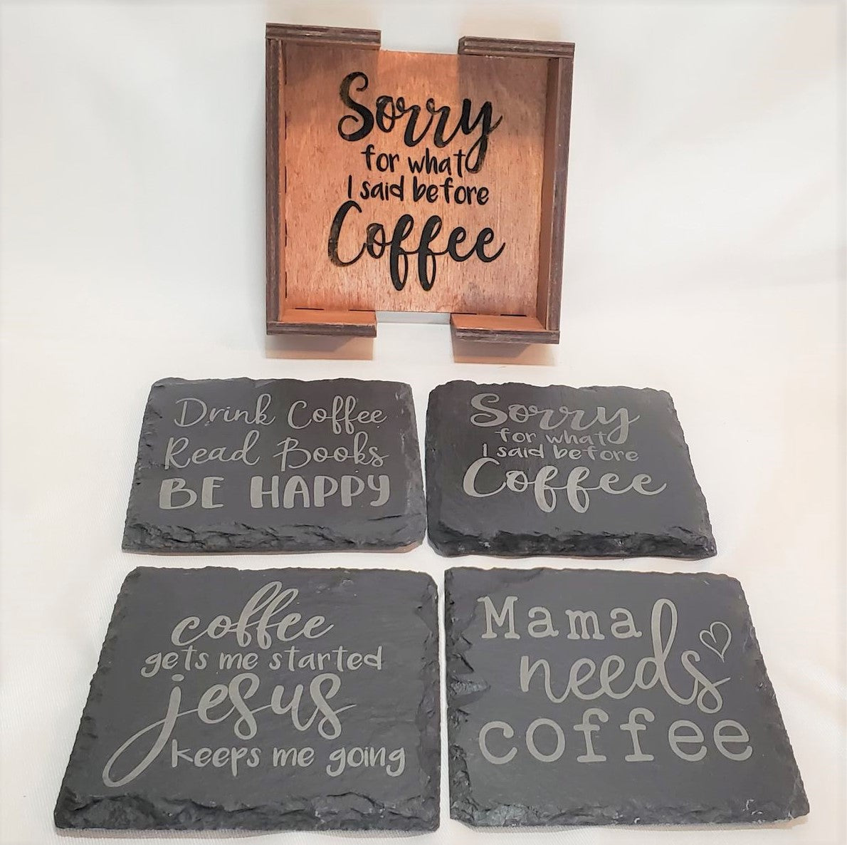 Protect your surfaces in style with our custom laser-engraved slate coasters! Whether you're looking for a single coaster or a complete set, we offer individual coasters or sets of four, with the option to add a matching holder for a sleek and organized display.